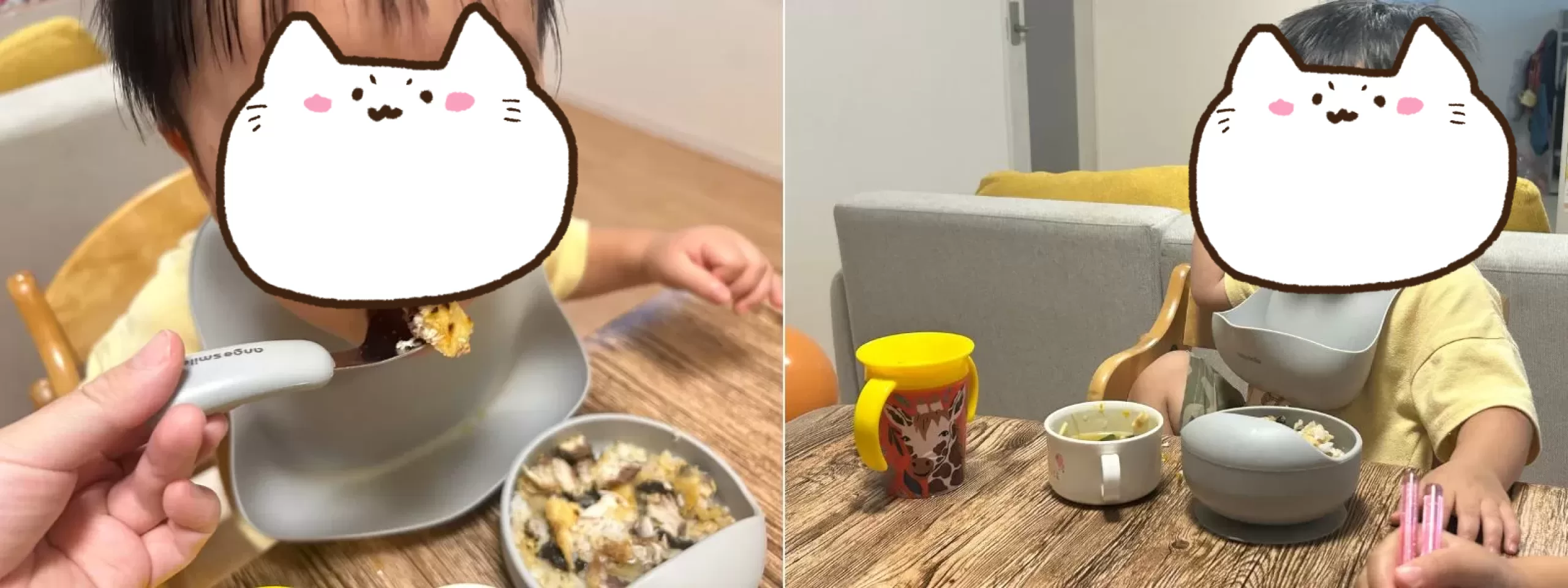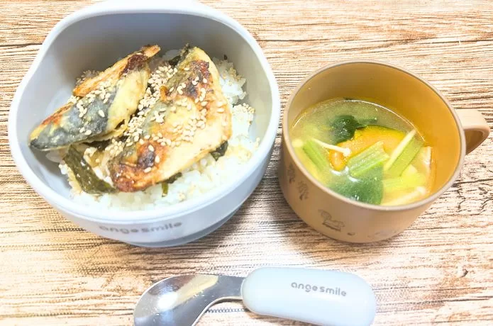 最初は不思議そうな顔で手が出ていませんでしたが、最初に補助して食べさせてみると気に入ったようでパクパク!結局、ご飯は少し残ったものの、鯖は全て食べきりました。
