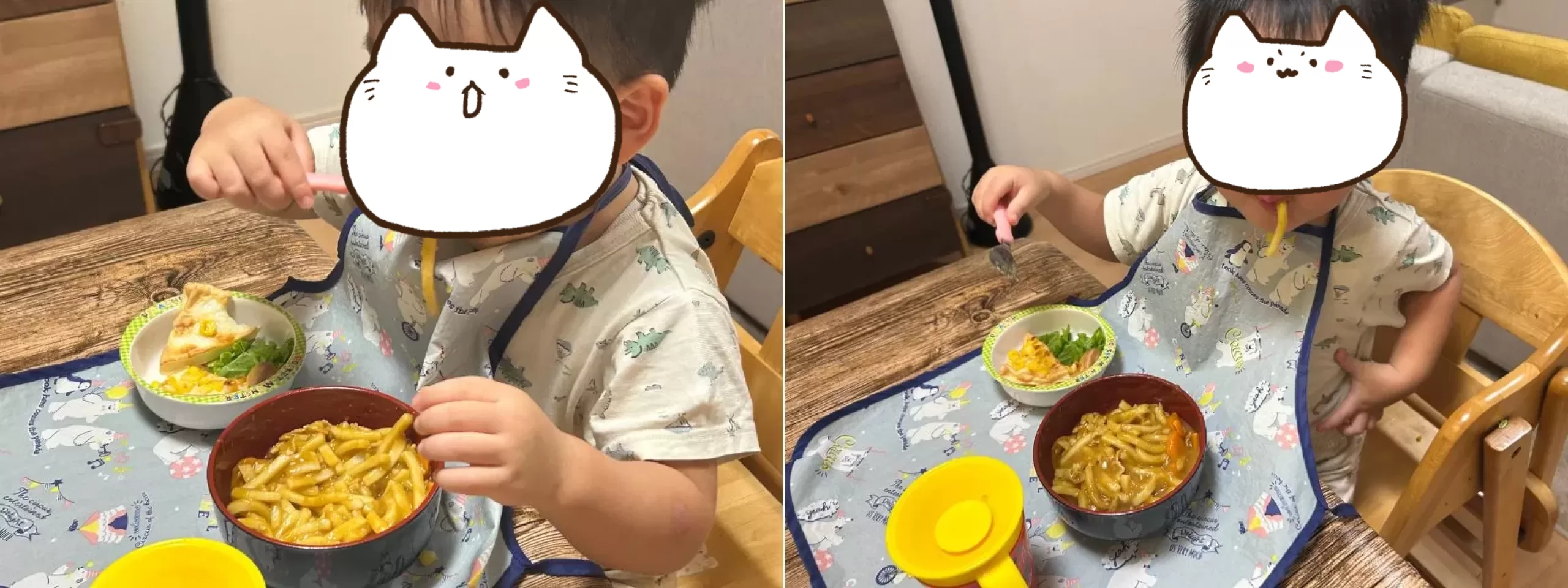 カレーライスもうどんも好きな息子。初めてのカレーうどんでしたが、抵抗なく最初から勢いよく食べ進めていきました。食べやすいように、麺を少し短くカットして提供しています。