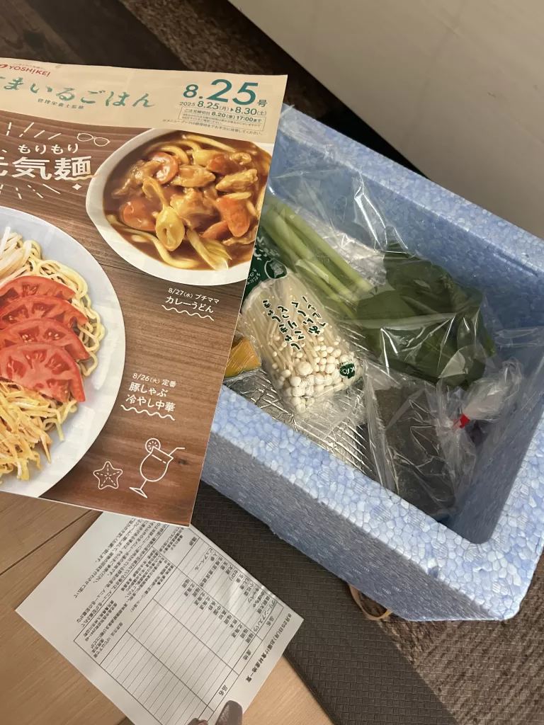 ここからは、実際に「ヨシケイ 手作り家庭メニュー」を試してみたときのレビューを、写真を交えながらご紹介します。まず1日目、クールBOXの中に食材とレシピブックが入っていました。