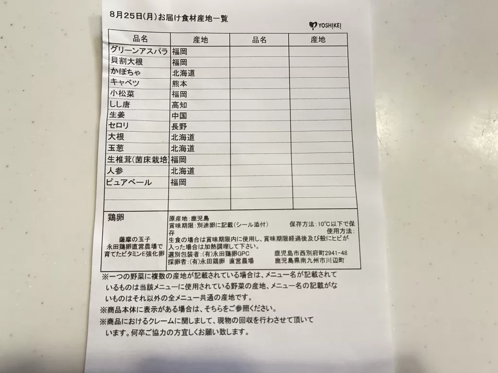 「ヨシケイ 手作り家庭メニュー」では、食材が届く際に、それぞれの食材の産地が記された紙も入っています。