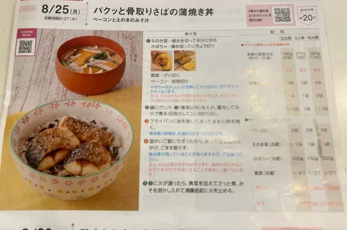 週の最初には、クールBOXの中にレシピブックが入っています。これを見ると、今週はどんなメニューになるのか分かるので、食材の買い出しや加える献立を少し考えておくことに役立ちそうですね。