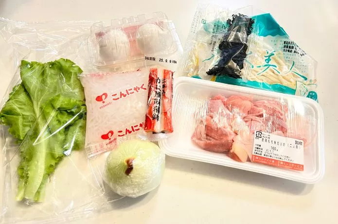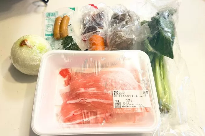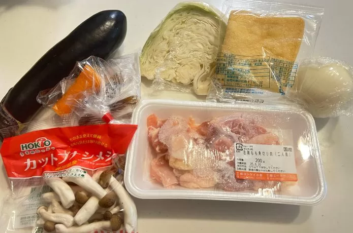 材料はこちら。余りがちなキャベツや人参が、必要な分だけ入っているのが嬉しいですね。また、ナスが丸ごと1本入っているボリュームの大きさに驚きました。