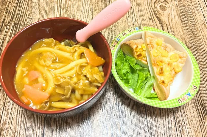 こちらが完成したカレーうどんとはんぺんのコーンマヨ焼きです。両方、息子にとってはほぼ初対面のメニュー!カレーうどんは煮込み時間が規定よりオーバーしてしまい、汁が少し少なくなってしまいました。