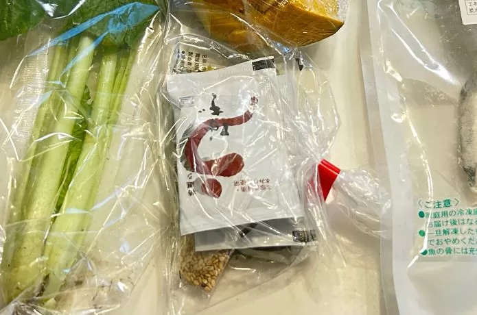 クールBOXは保冷剤がたっぷり入っていて、魚もまだ冷凍されている状態でした。生鮮食品を安全に受け取れるのは安心です。調味用ソースなども入っていて、手軽に味付けできることが分かりました。