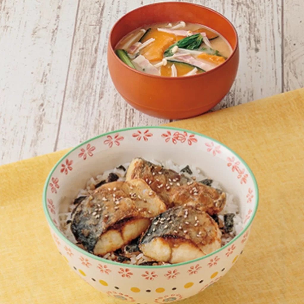 1.【魚も野菜も摂れる!】パクッと骨取りさばの蒲焼き丼・ベーコンとえのきのみそ汁