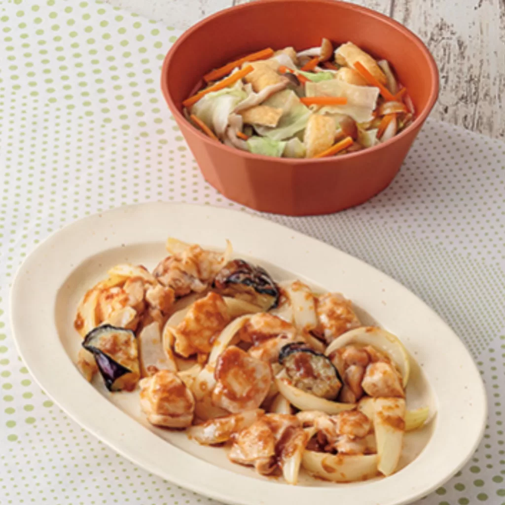 鶏肉とナスがごろごろ入った炒め物に、野菜ときのこをたっぷりとれる煮物。大根おろしは自分で作ると手間がかかりますが、ソースになって入っているのでとってもお手軽!
