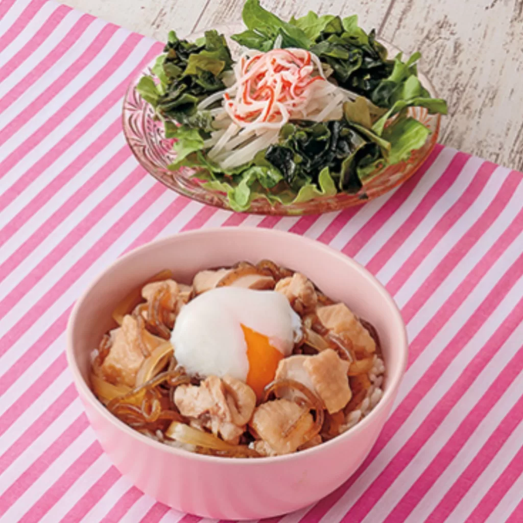4.【甘辛とろとろ】とろ~り温玉のせ鶏すき丼・かにかまとわかめのさっぱりサラダ